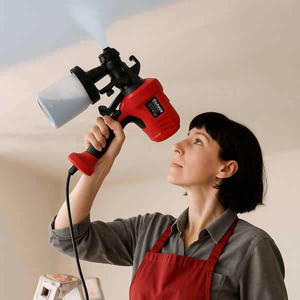 Специјалната млазница произведува фина магла од боја што се наталожува рамномерно, без линии или дамки. Алатката создава чувство дека секоја област се бои сама „како што треба“, без оглед на материјалот, искуството на корисникот или насоката на движење.