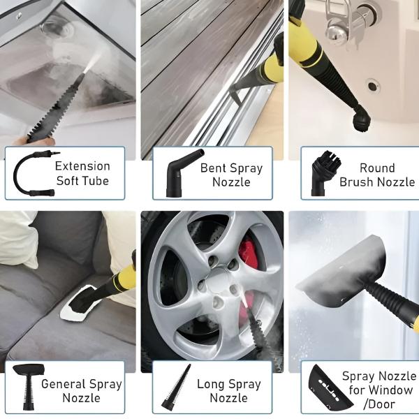 Вклучува четки, млазници и јастучиња за чистење на подови, фуги, прозорци и друго.